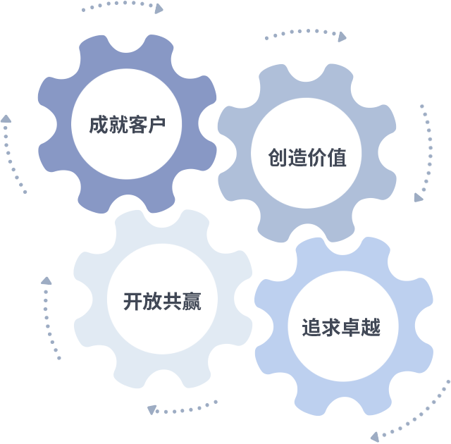 成就客户是一切决策的出发点,,,,创造价值是衡量所有工作的标准,,,追求卓越是我们做事做人的态度,,,,开放共赢是我们的格局也是最终的结果。。。。价值观的齿轮环环相扣,,,推动着组织里的每个人不断向前。。。。